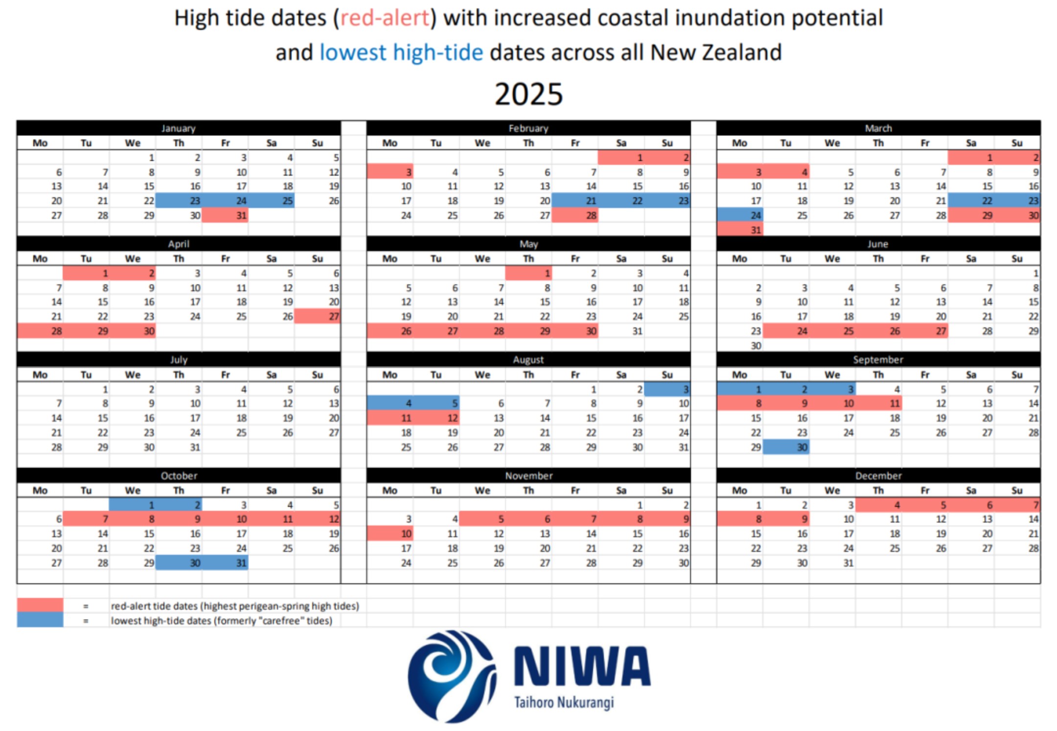 NIWA publishes when these perigean spring tides will occur – which they call red alert days.