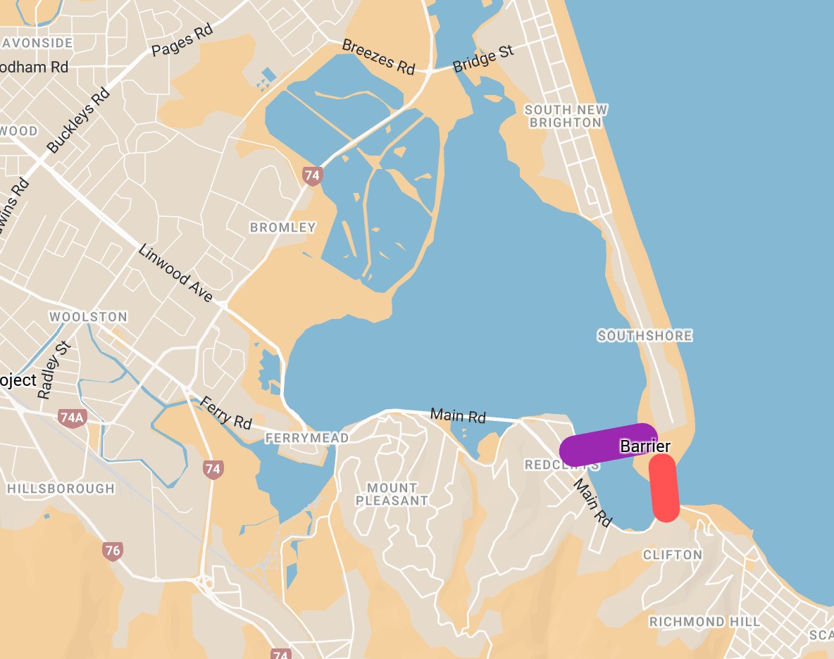 - Between Beachville Road in Redcliffs and the Southshore Spit, at a more stable point of the spit. (Purple in the map)